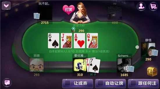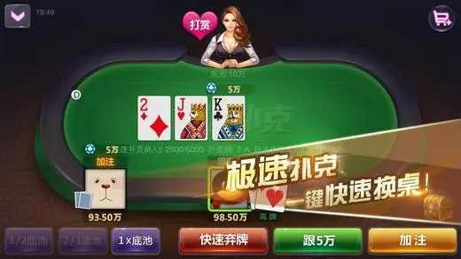 3、当此局开始后,自己本身有两张底牌,局中所有人都是2张,接下来桌上要发四轮,一共5张,自己的二张+5张内任意3张,组成上述的牌类,总牌来比大小。当然,您觉得实在不好可以弃掉。